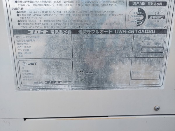 塩谷郡 コロナ電気温水器UWH-4614AD2U→コロナ自然冷媒CO2家庭用ヒートポンプ給湯機貯湯ユニットCTU-S46AY5K エコキュート交換工事