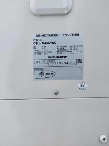 塩谷郡 コロナ自然冷媒CO2家庭用ヒートポンプ給湯機貯湯ユニットCTU-S46AY5K エコキュート交換工事